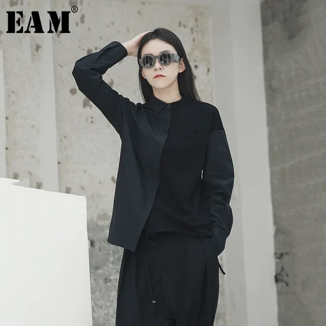 Cheap Offer [EAM] 2020 New Spring Autumn Lapel Long Sleeve Hit Color Loose Brief Irregular Stitching Shirt Wome with FREE Worldwide Shipping!