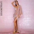 LOVE&LEMONADE Sexy Rose Gold Deep V-Neck Whit Split Sequins Party Maxi Dress LM81849