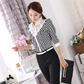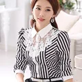 New Women Lace Spliced Embroidery OL Blouses Tops Feminine Slim Shirt Korean Fashion Stripe Tops Pl