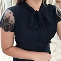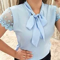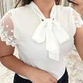 Umeko Lace Up Bow Tie Shirt 2019 Summer Short Sleeve Chiffon Casual Blouse Plus Size 5xl Office Lad