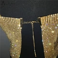AKYZO Women Sparkly Rhinestone Halter Metal Chain Dress 2019 New Nightclub Gold Silver Backless Split Hip 2 Pieces Set Dress