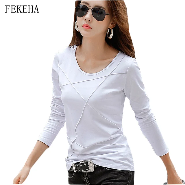 FEKEHA White T-shirt Women 2019 Spring Autumn Cotton Female Long Sleeve T Shirts V-Neck Ladies Tops Casual Tees Plus Size 3XL