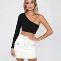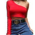Red White Sexy T-Shirt For Female Bustier Crop Top T Shirt Casual One Off Shoulder long sleeve Crop